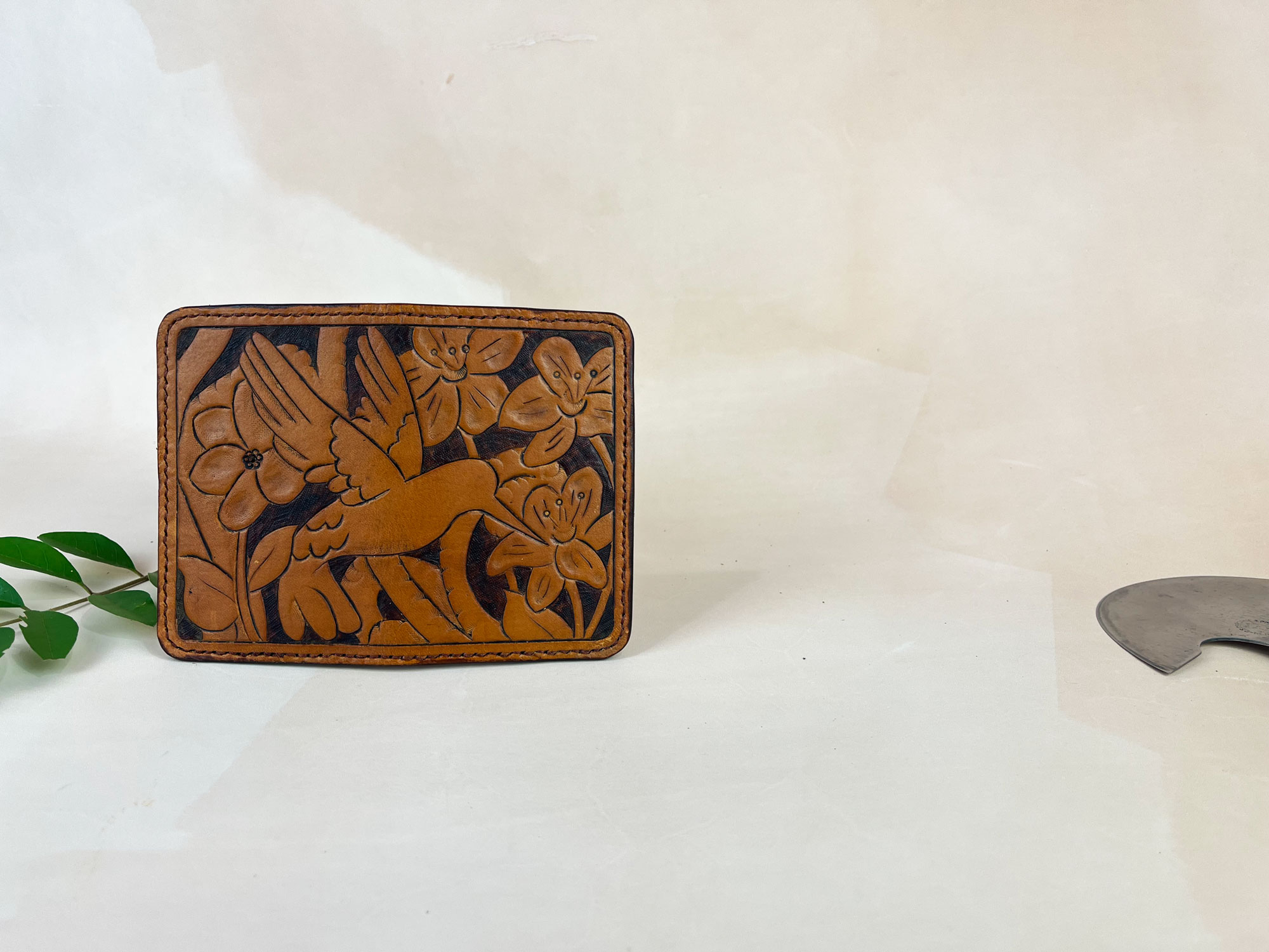 The original artwork carved into this handcrafted leather bifold wallet celebrates the beauty of the natural world. Meant to evoke motion, the hand-tooled hummingbird flits amidst sweet-smelling flowers.